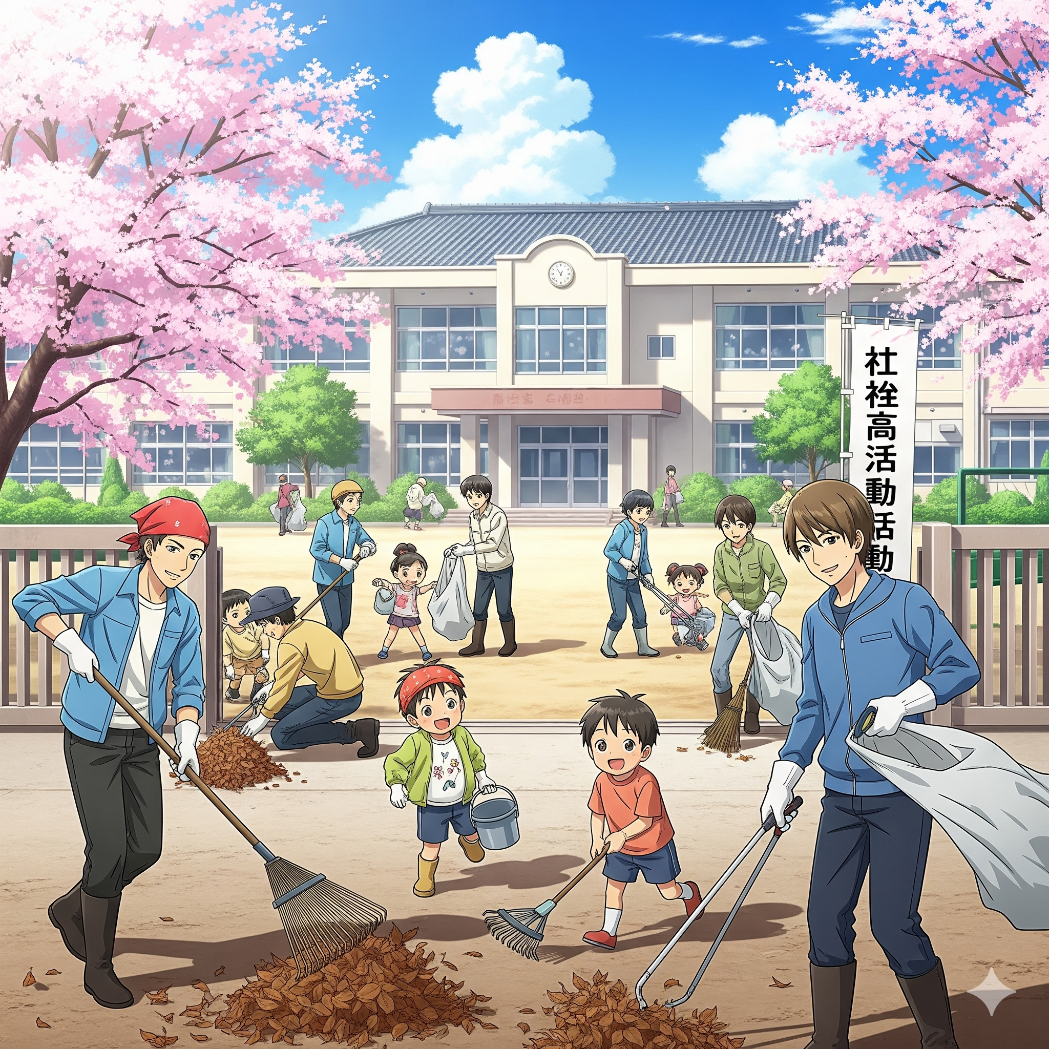 運動会に向けてグラウンドに土を入れて整備したり、落ちている枝葉や側溝に溜まっている泥を集めて綺麗にします。
